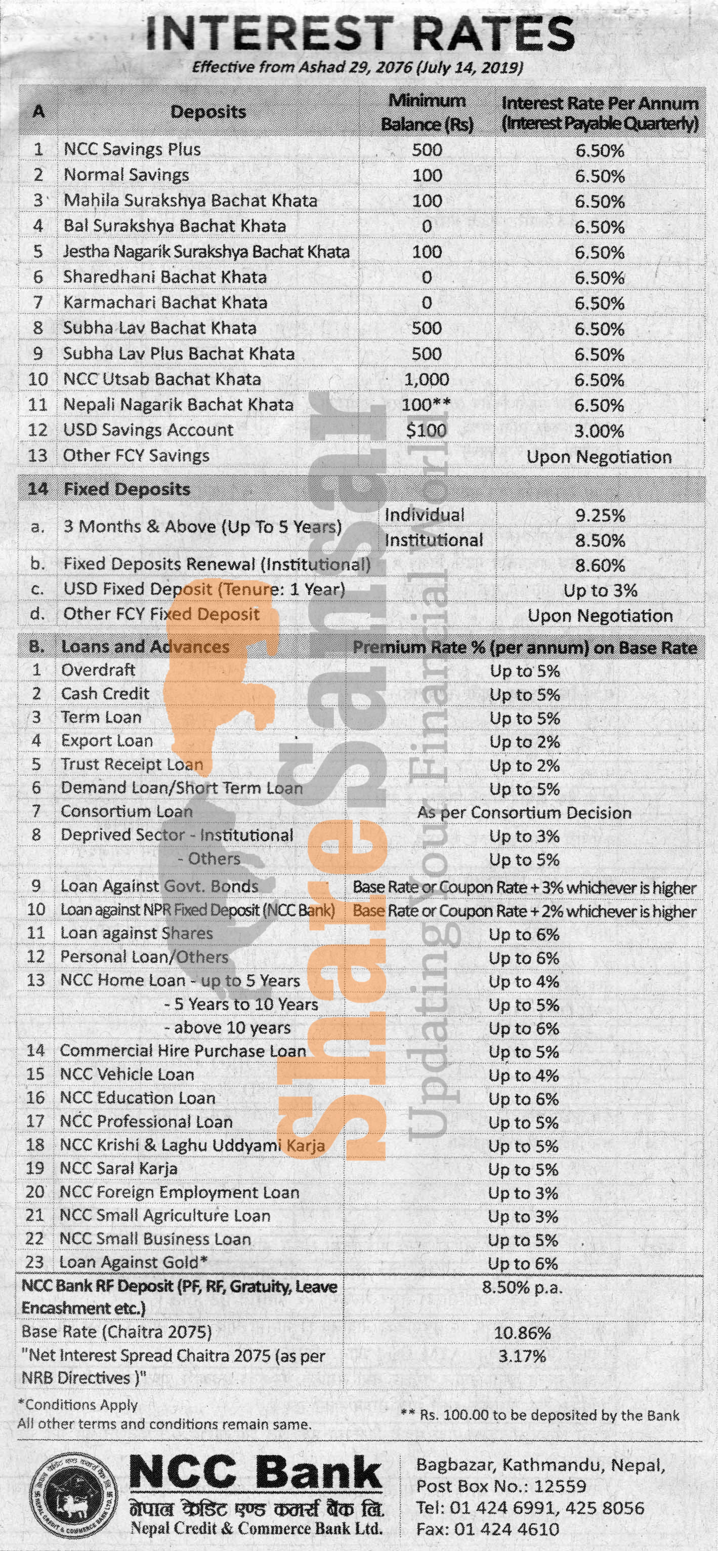 Nepal Credit & Commerce Bank Limited has published a notice regarding new interest rate and its effective from 29th Ashad, 2076.