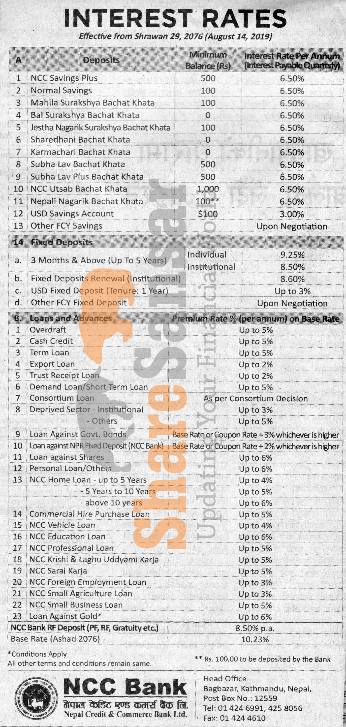 Nepal Credit & Commerce Bank Limited has published a notice regarding new interest rate and its effective from 29th Shrawan, 2076.