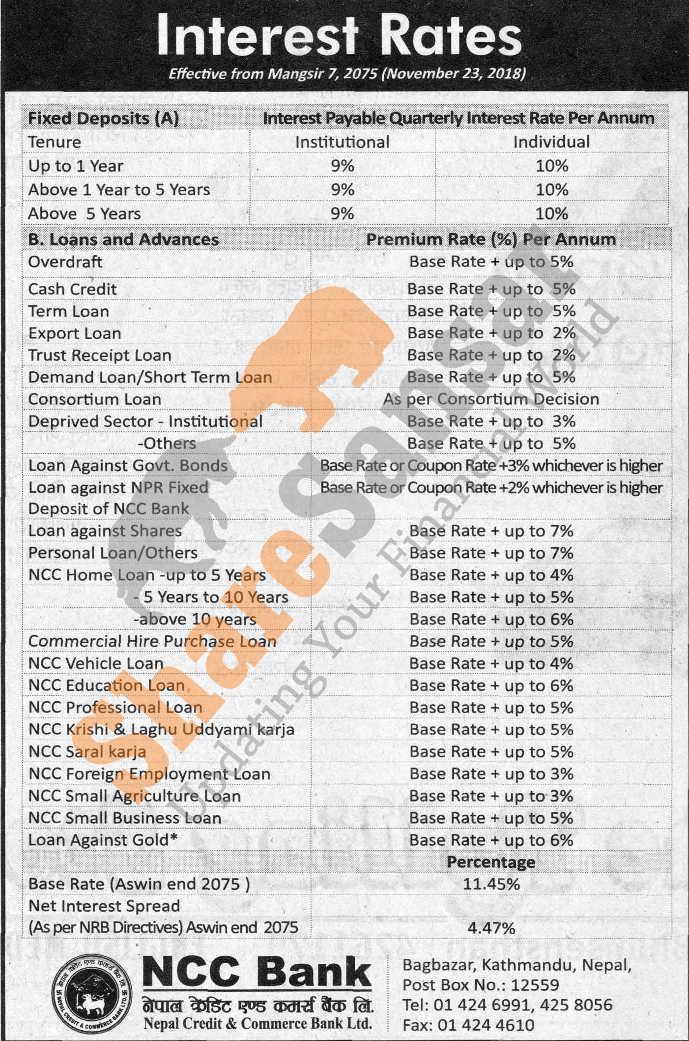 Nepal Credit & Commerce Bank Limited has published a notice regarding new interest rate and its effective from 7th Mangsir, 2075.