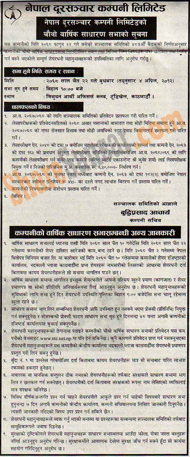 Nepal Doorsanchar Company Limited has announced its 4th Annual General Meeting going to be held on 22nd Chaitra 2068.