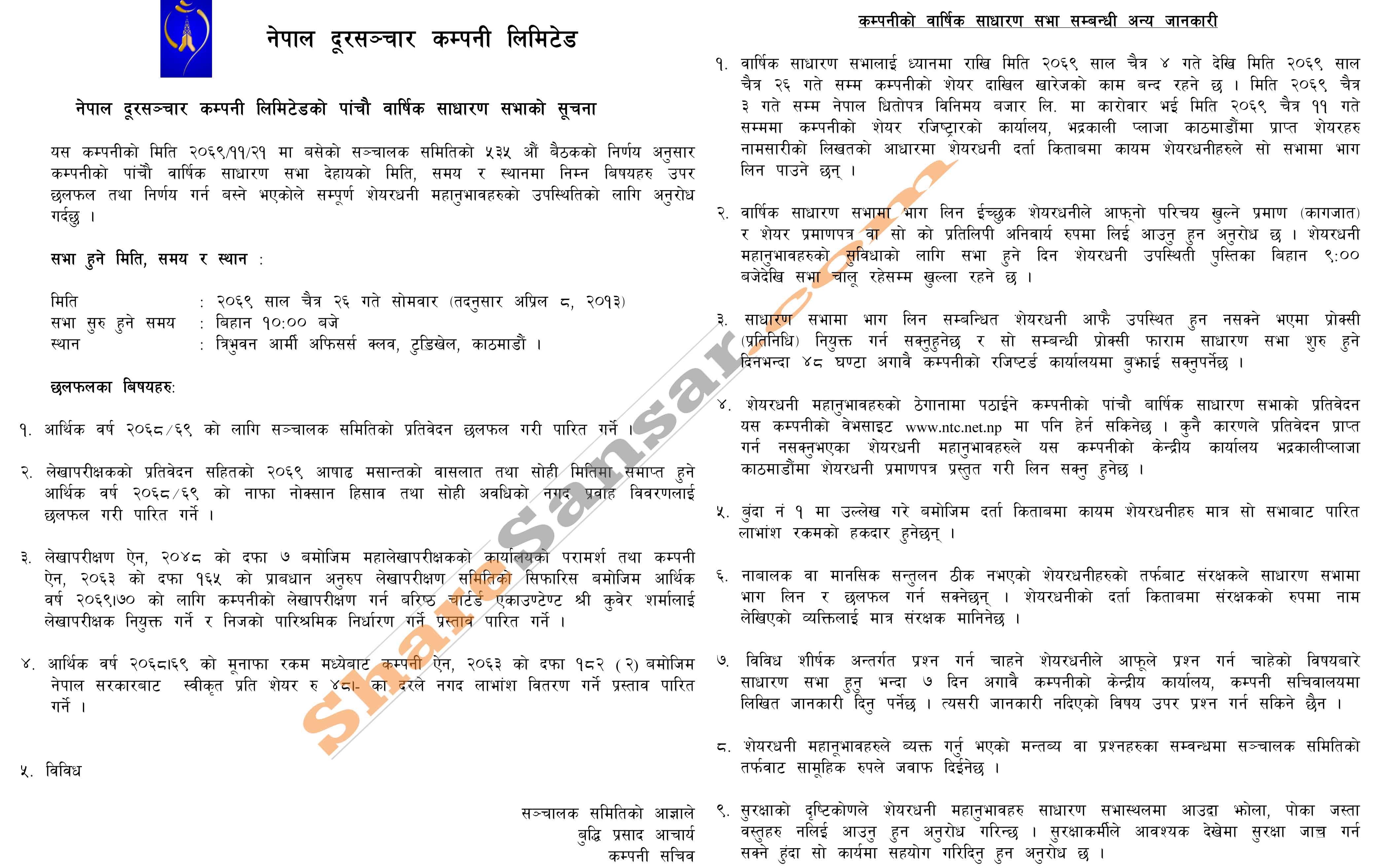 Nepal Doorsanchar Company Limited has announced its 5th AGM going to be held on 26th Chaitra, 2069.