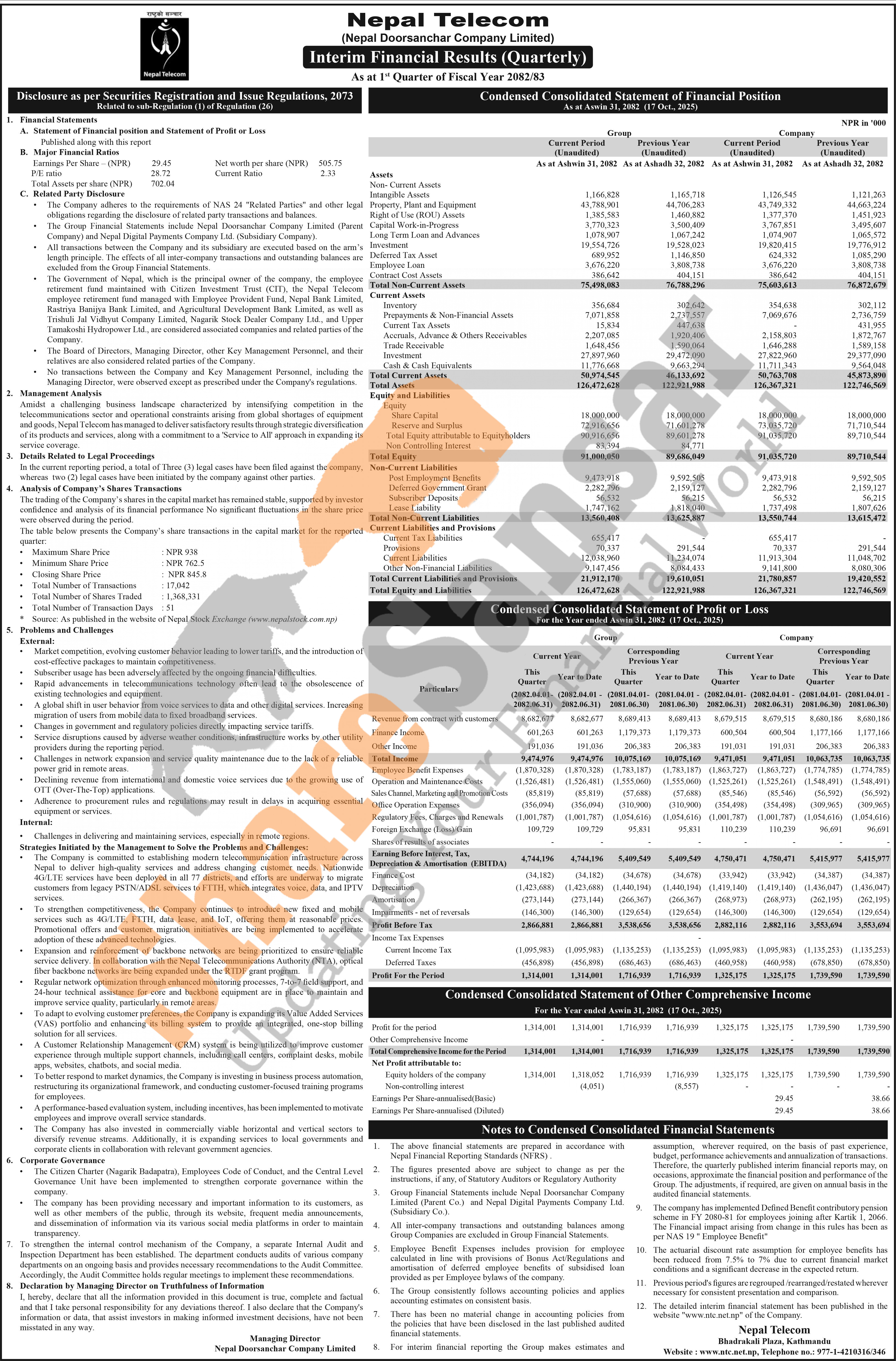 Nepal Doorsanchar Company Limited has posted a net profit of Rs 1.32 billion and published its 1st quarter company analysis of the fiscal year 2082/83.