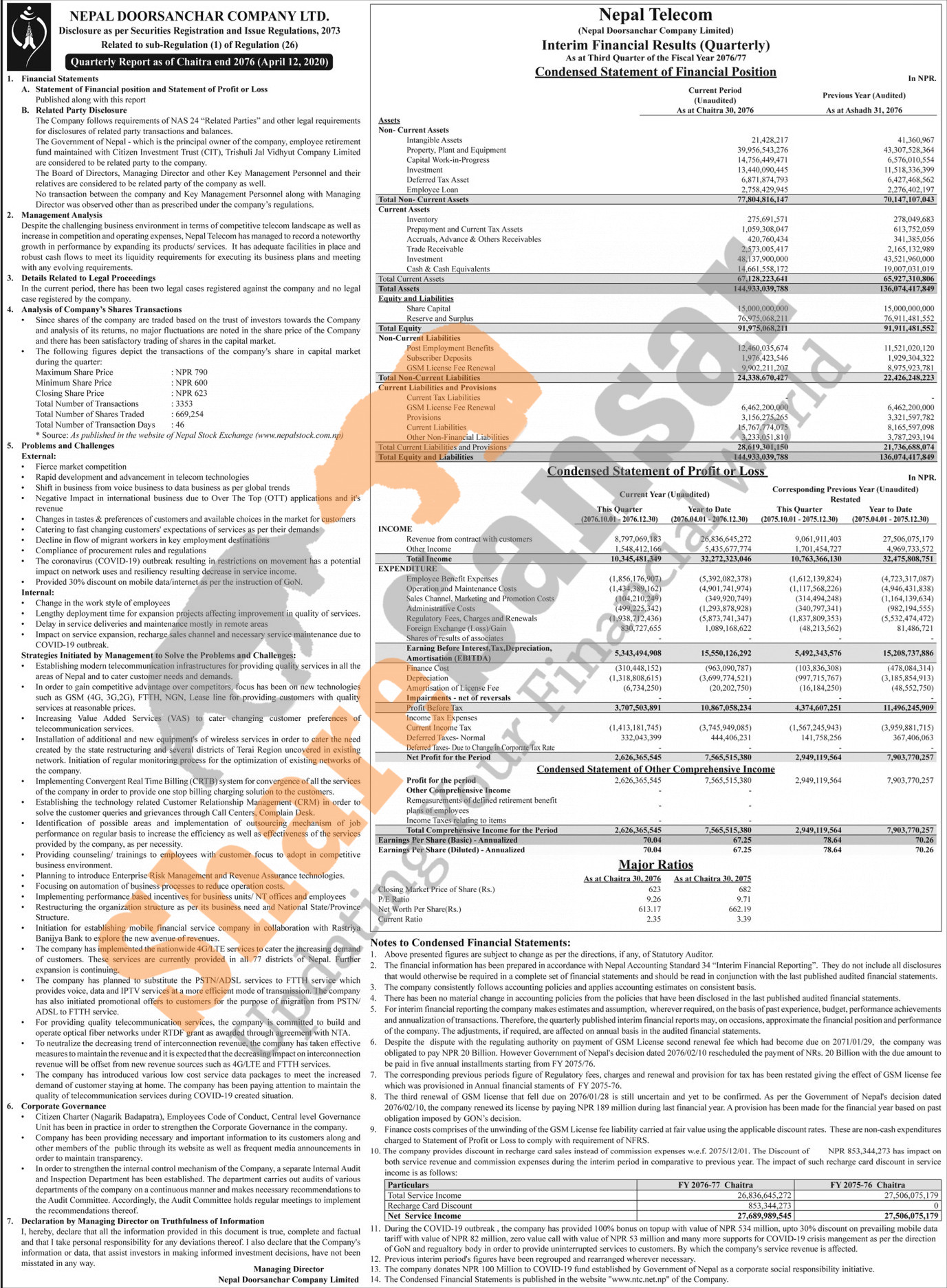 Nepal Doorsanchar Company Limited has posted a net profit of Rs 7.56 billion and published its 3rd quarter company analysis of the fiscal year 2076/77.