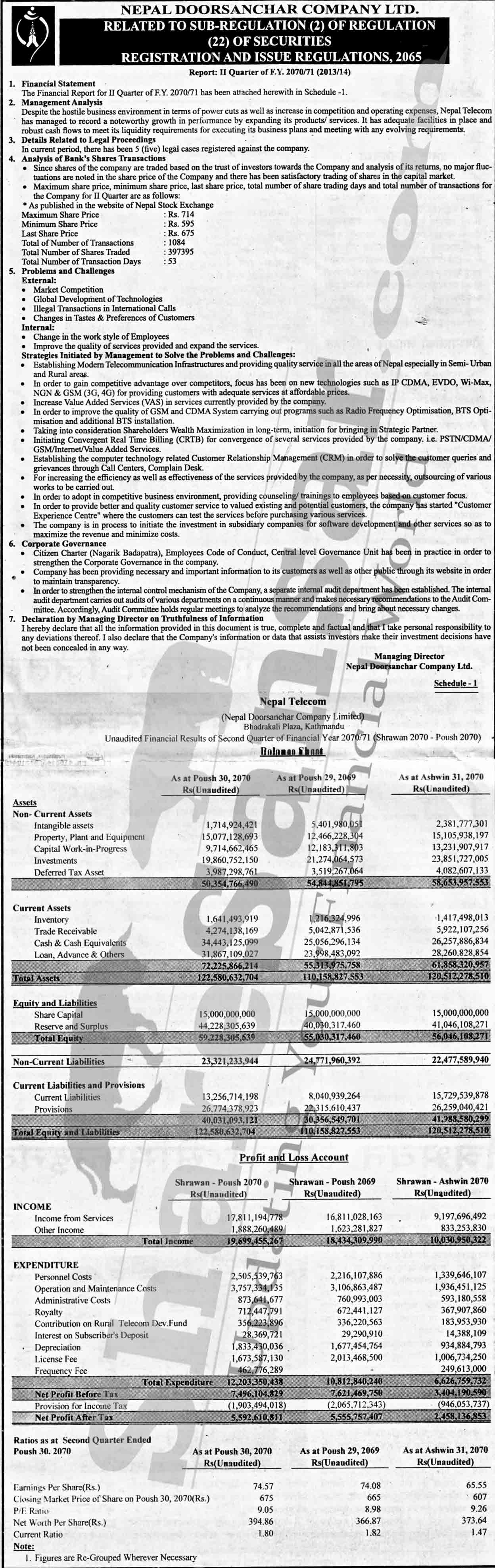 Nepal Doorsanchar Company Limited has posted net profit of Rs.5.59 billion and published its 2nd quarter company analysis of the fiscal year 2070/71.