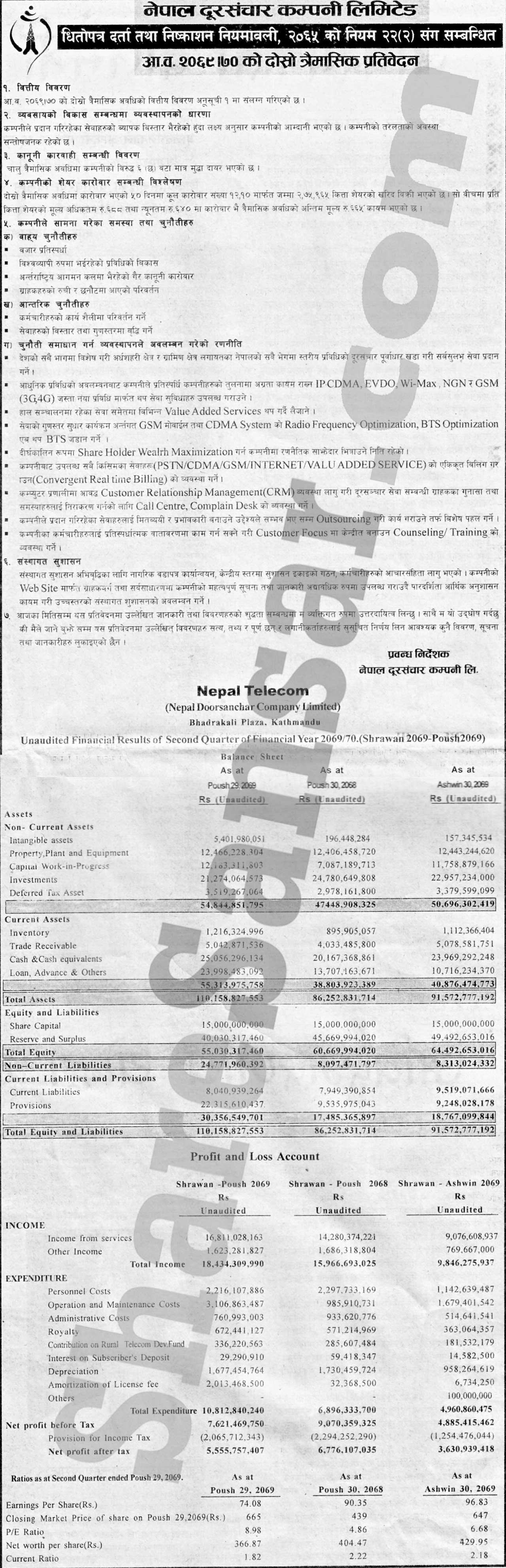 Nepal Doorsanchar Company Limited has posted net profit of Rs.5,555.75 million and published its 2nd quarter company analysis of the fiscal year 2069/70.