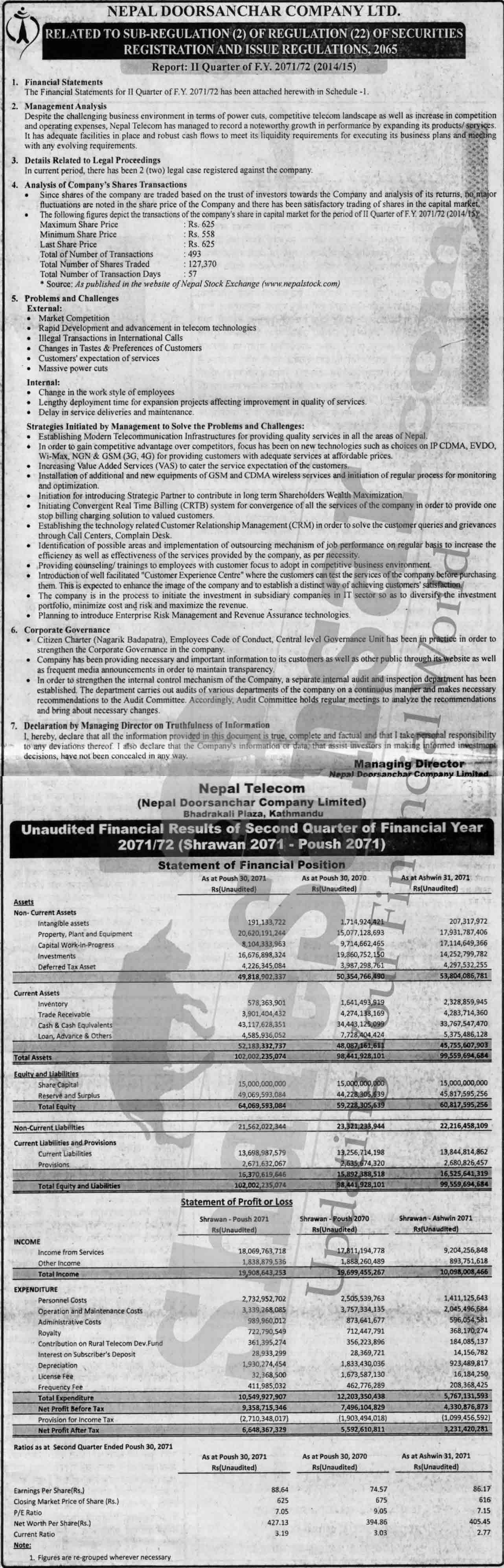 Nepal Doorsanchar Company Limited has posted net profit of Rs.6648.36 million and published its 2nd quarter company analysis of the fiscal year 2071/72.