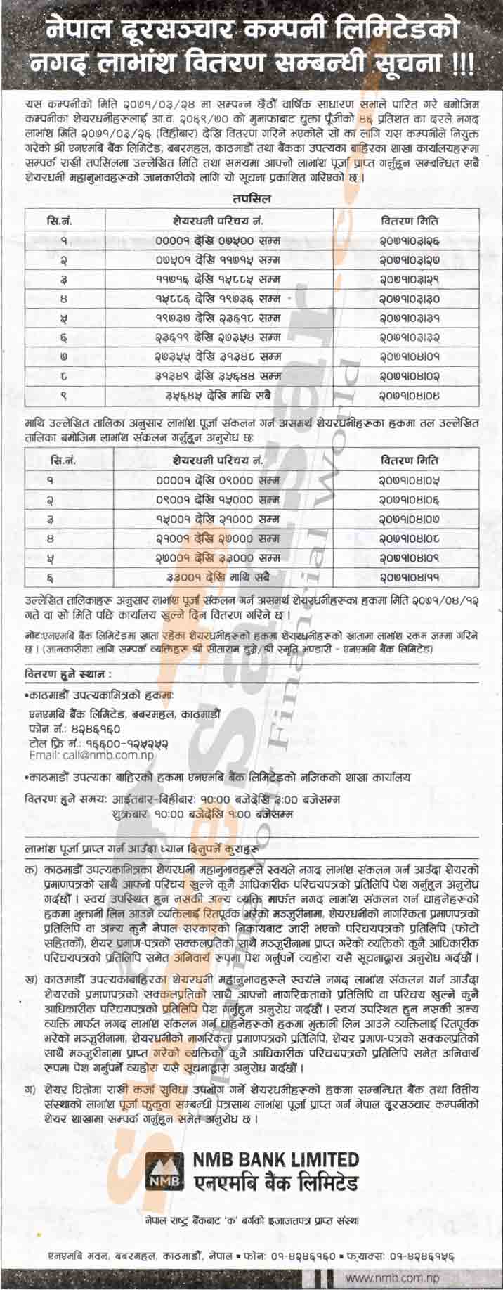 Nepal Doorsanchar Company Limited is going to distribute 46% Cash Dividend warrant to its shareholders from (26th Ashad, 2071).