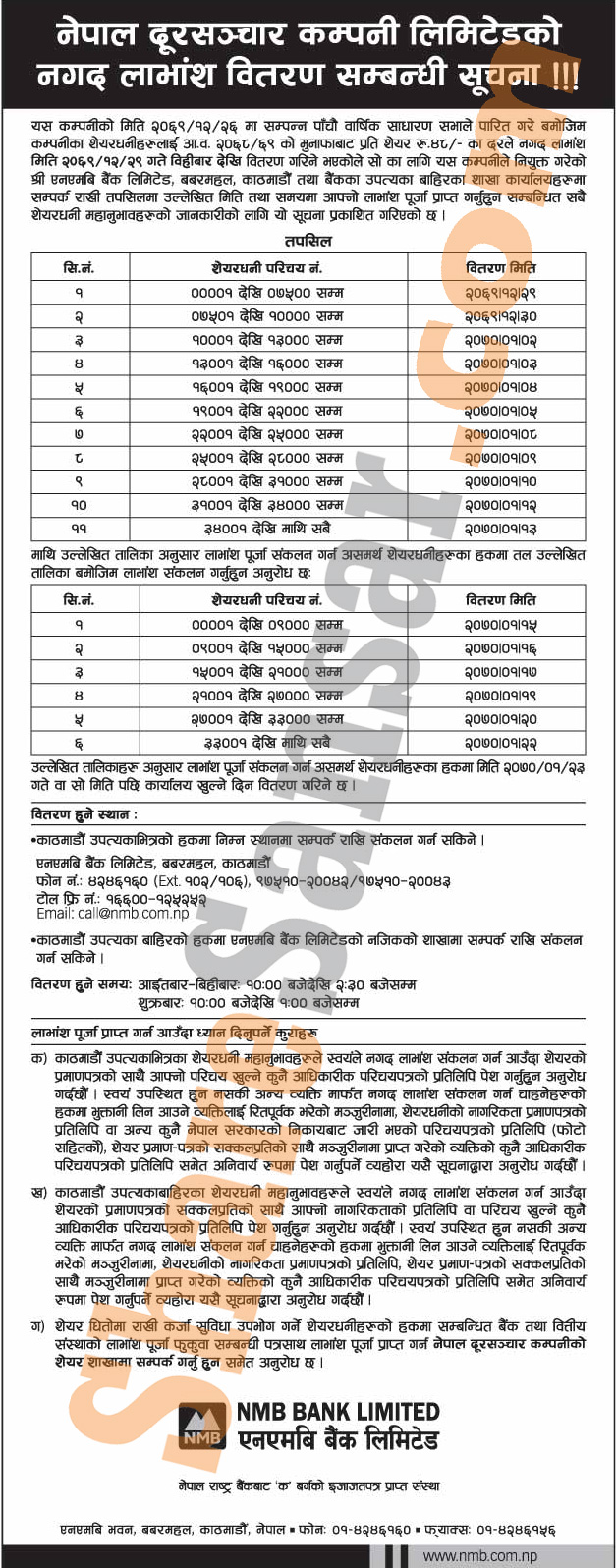 Nepal Doorsanchar Company Limited is going to distribute Rs.48 Cash Dividend warrant to its shareholders from (29th Chaitra, 2069).