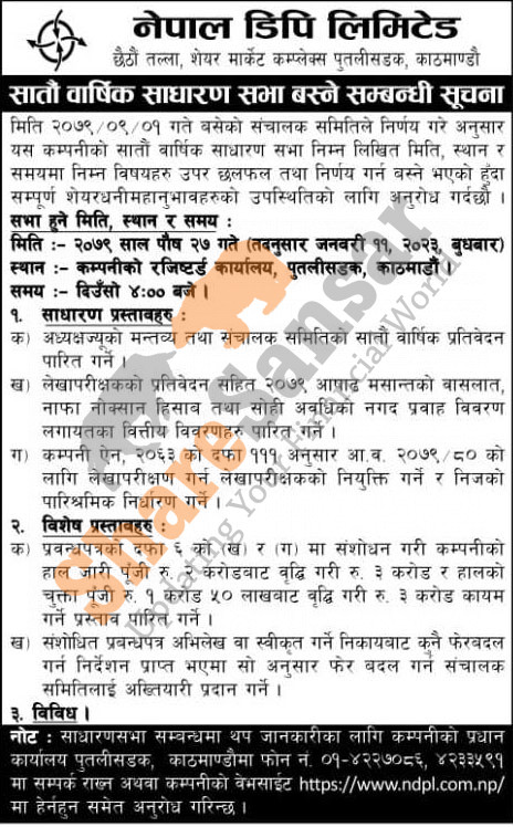 Nepal DP Limited has announced its 7th AGM going to be held on 27th Poush, 2079.