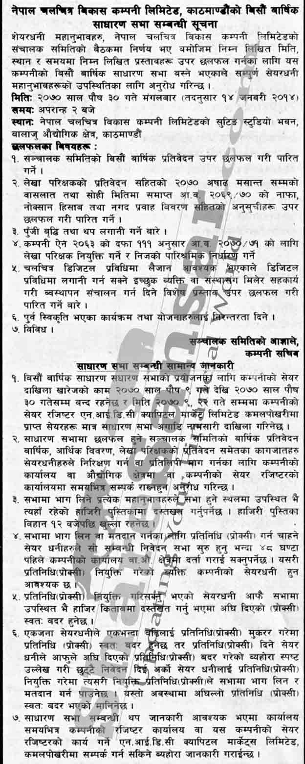 Nepal Film Development Company Limited has announced its 20th AGM going to be held on 30th Poush, 2070.