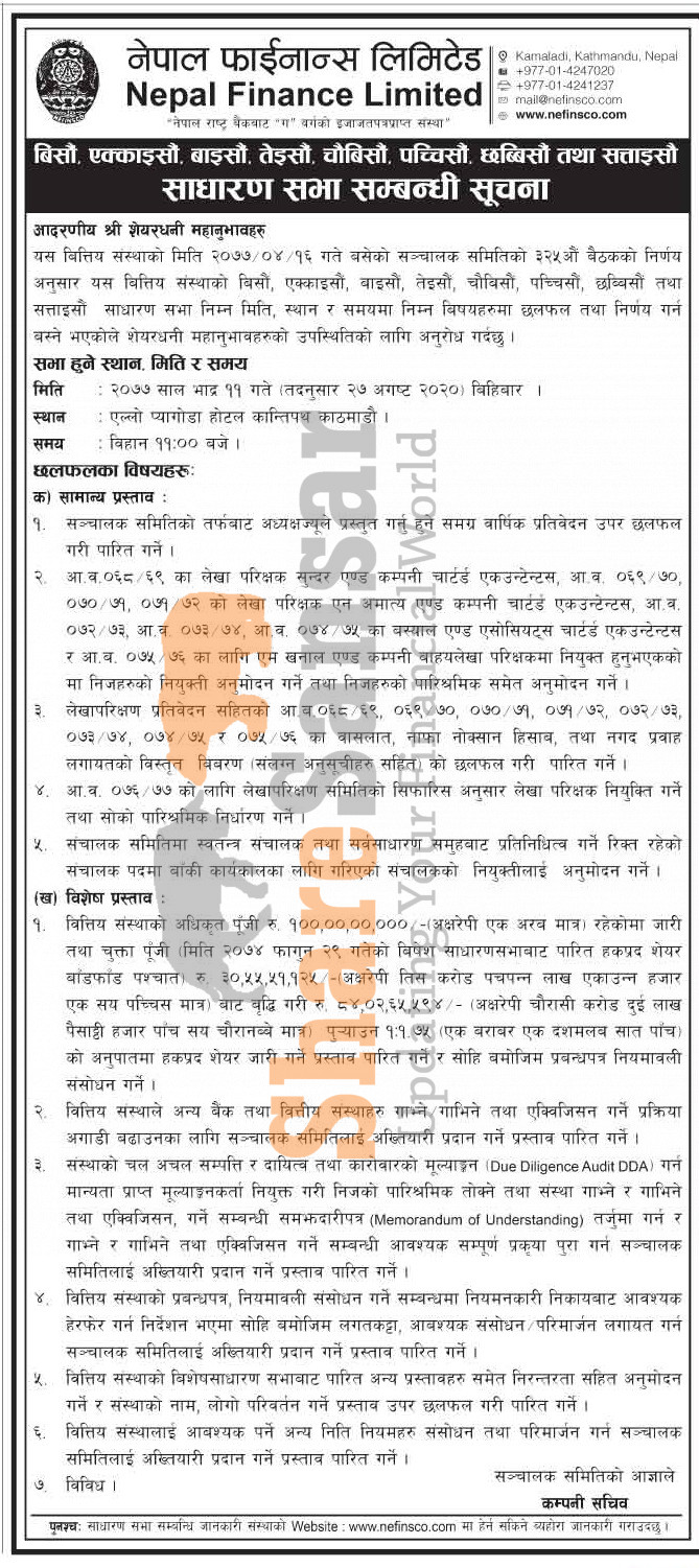 Nepal Finance Limited has announced its 20th, 21st, 22nd, 23rd, 24th, 25th, 26th & 27th AGM going to be held on 11th Bhadra, 2077.
