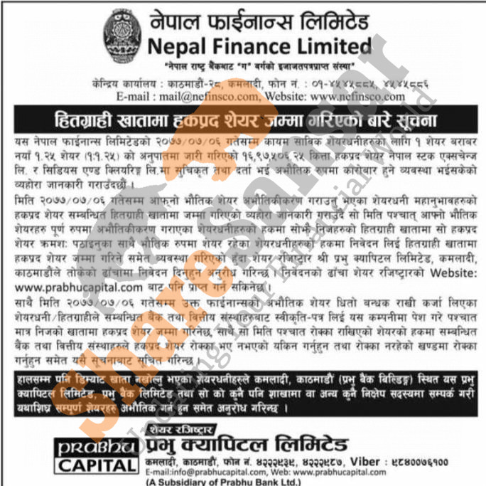 Nepal Finance Limited has distributed 1:1.25 ratio right shares directly to DEMAT accounts of its shareholders and urged to dematerialize their shares.