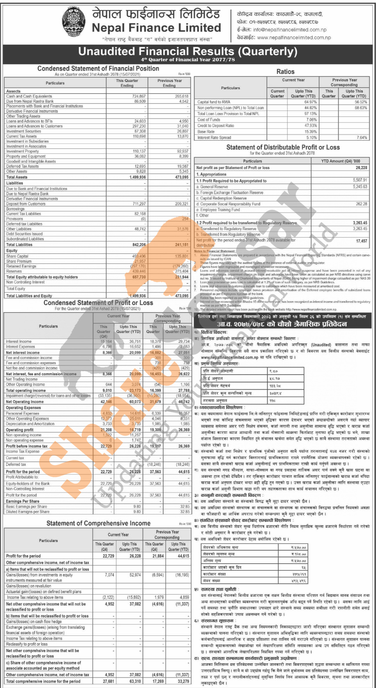 Nepal Finance Limited has posted a net profit of Rs 26.22 million and published its 4th quarter company analysis of the fiscal year 2077/78.