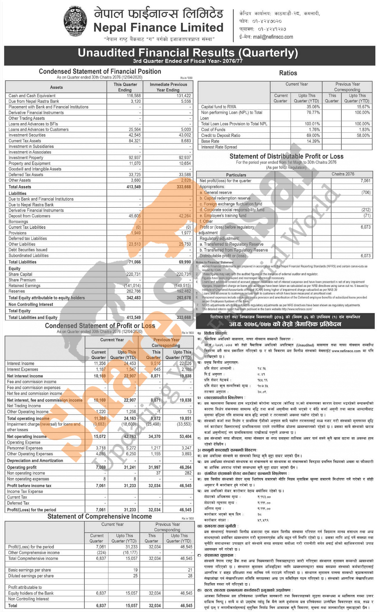 Nepal Finance Limited has posted a net profit of Rs 31.23 million and published its 3rd quarter company analysis of the fiscal year 2076/77.