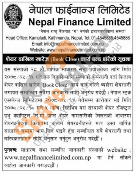 Nepal Finance Limited has published a book closure date for its 28th AGM on 15th Bhadra, 2078.