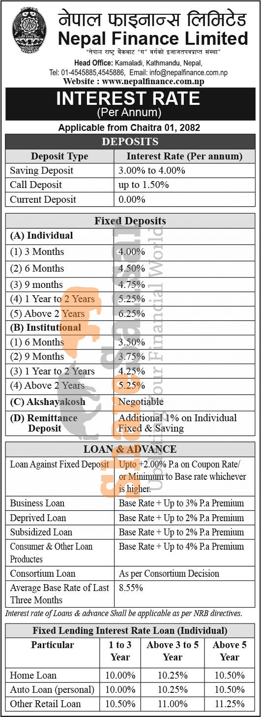 Nepal Finance Limited has published a notice regarding the new interest rate for deposit and loan products and it's effective from 1st Chaitra, 2081.