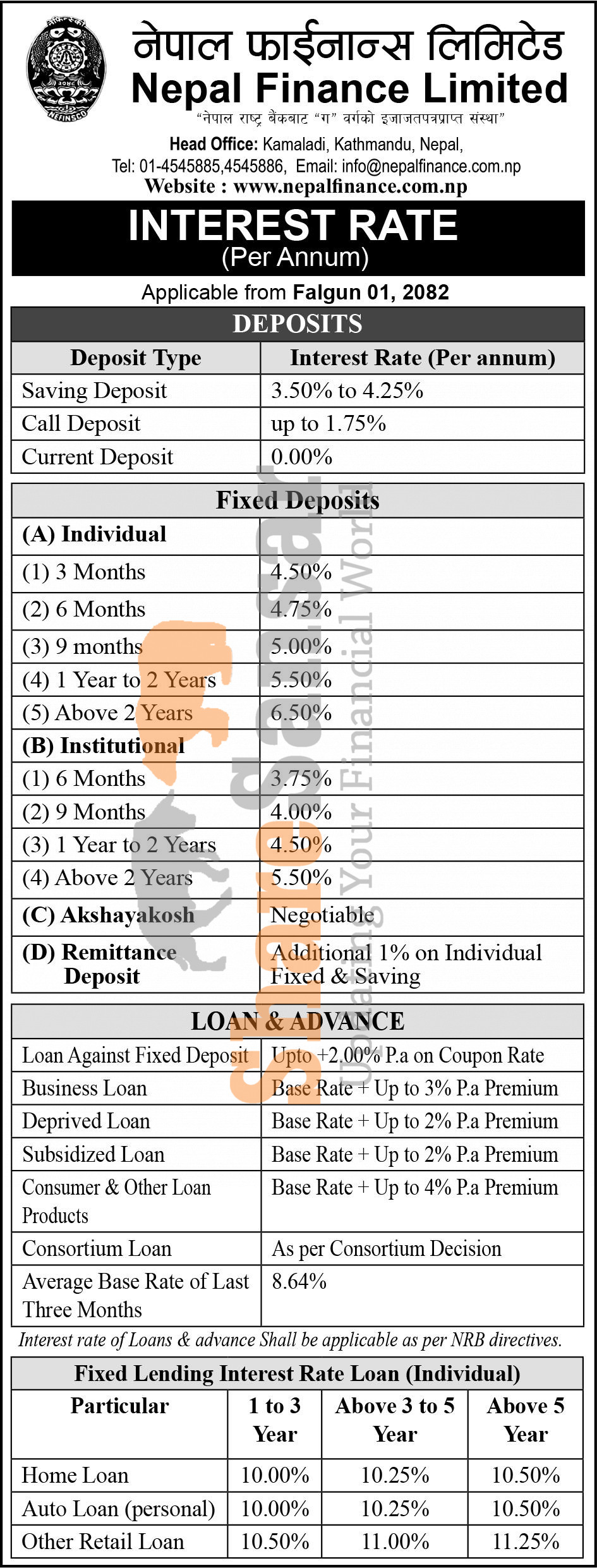 Nepal Finance Limited has published a notice regarding the new interest rate for deposit and loan products and it's effective from 1st Falgun, 2081.