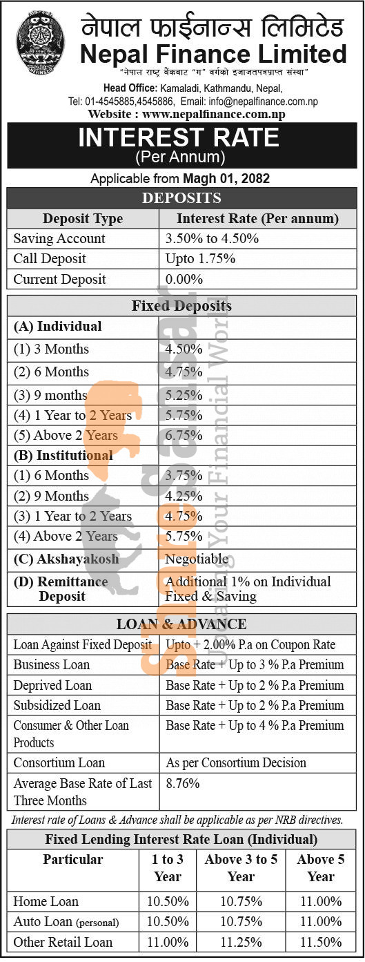 Nepal Finance Limited has published a notice regarding the new interest rate for deposit and loan products and it's effective from 1st Magh, 2081.