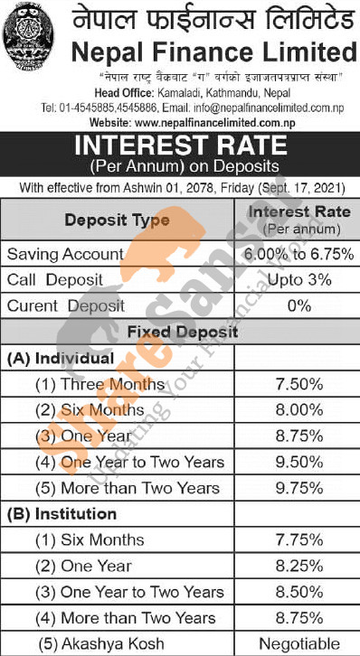 Nepal Finance Limited has published a notice regarding the new interest rate for its deposit products and it's effective from 1st Ashwin, 2078.