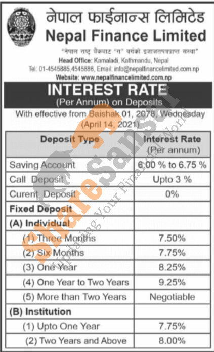 Nepal Finance Limited has published a notice regarding the new interest rate for its deposit products and it's effective from 1st Baisakh, 2078.