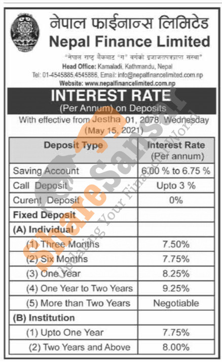 Nepal Finance Limited has published a notice regarding the new interest rate for its deposit products and it's effective from 1st Jestha, 2078.