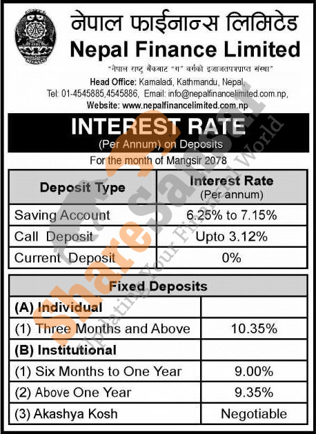 Nepal Finance Limited has published a notice regarding the new interest rate for its deposit products and it's effective from 1st Mangsir, 2078.