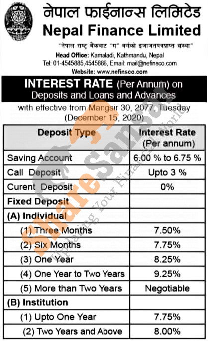 Nepal Finance Limited has published a notice regarding the new interest rate for its deposit products and it's effective from 30th Mangsir,2077.