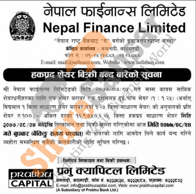 Nepal Finance Limited is closing it's 1:1.25 ratio 16,97,506.25 units right share to its shareholders from today (24th Mangsir, 2077).