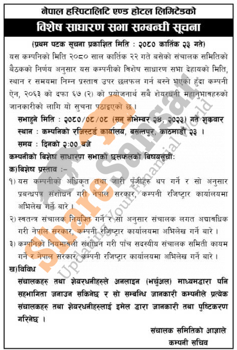 Nepal Hospitality and Hotel Limited has announced its SGM going to be held on 8th Mangsir, 2080.