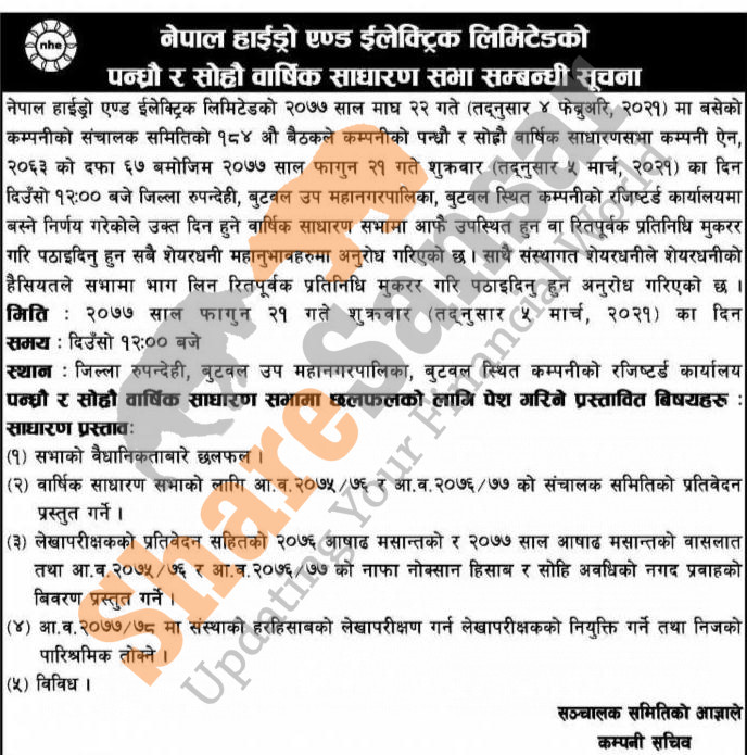 Nepal Hydro and Electric Limited has announced its 15th and 16th AGM going to be held on 21st Falgun, 2077.
