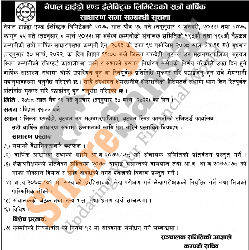 Nepal Hydro and Electric Limited has announced its 17th AGM going to be held on 16th Chaitra, 2078.