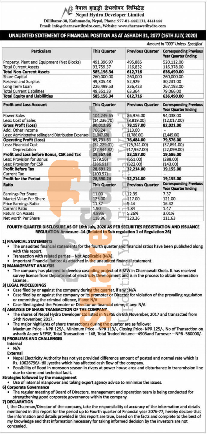 Nepal Hydro Developer Limited has posted a net profit of Rs 28.59 million and published its 4th quarter company analysis of the fiscal year 2076/77.