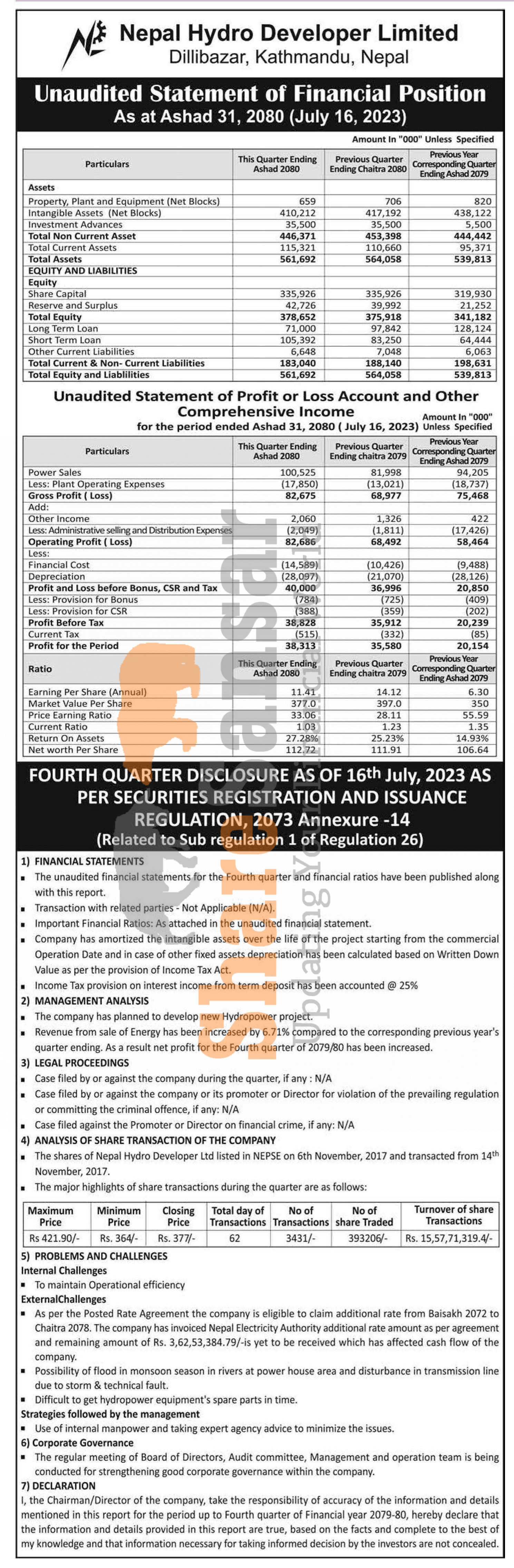 Nepal Hydro Developer Limited has posted a net profit of Rs 38.31 million and published its 4th quarter company analysis of the fiscal year 2079/80.
