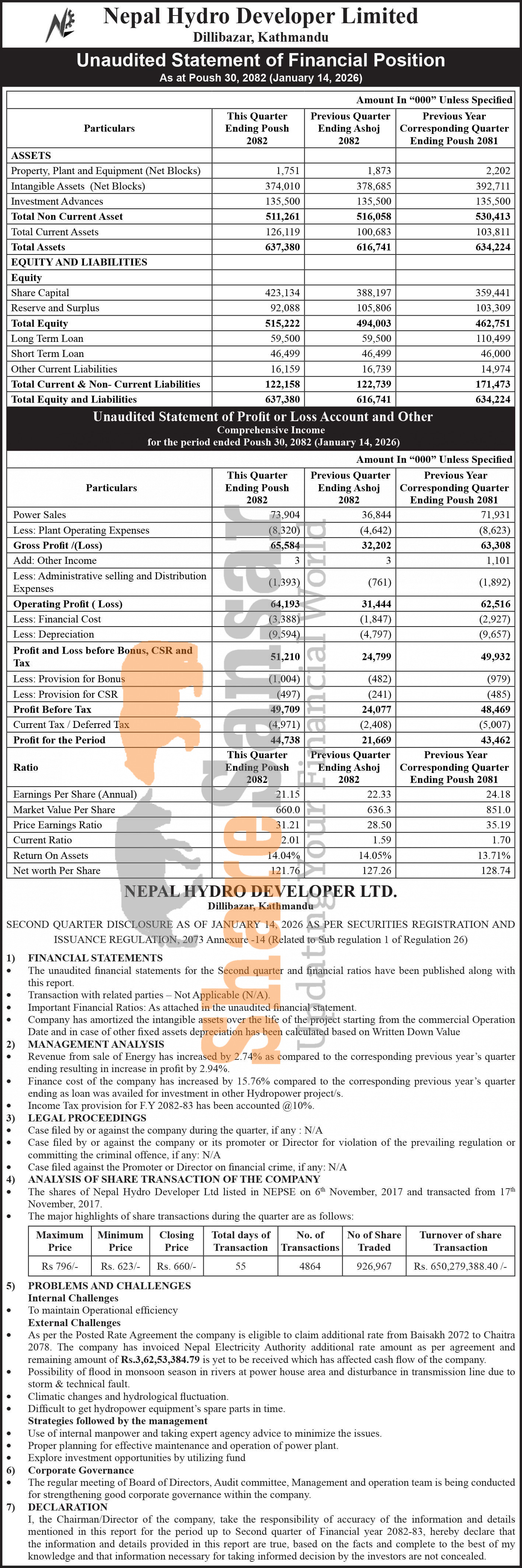 Nepal Hydro Developer Limited has posted a net profit of Rs 44.73 million and published its 2nd quarter company analysis of the fiscal year 2082/83.