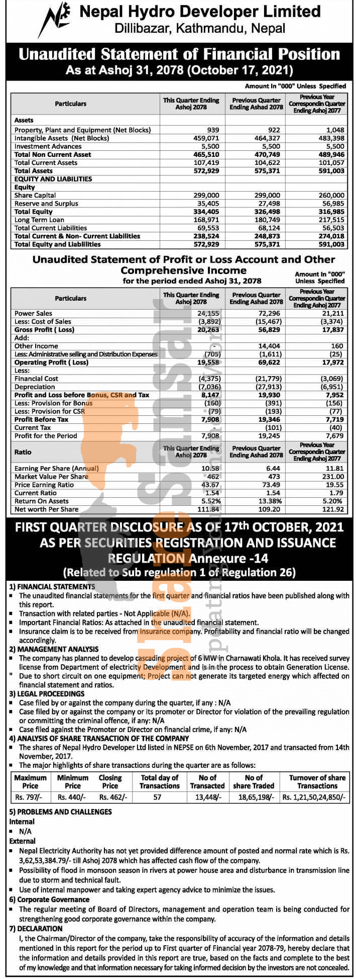 Nepal Hydro Developer Limited has posted a net profit of Rs 7.90 million and published its 1st quarter company analysis of the fiscal year 2078/79.