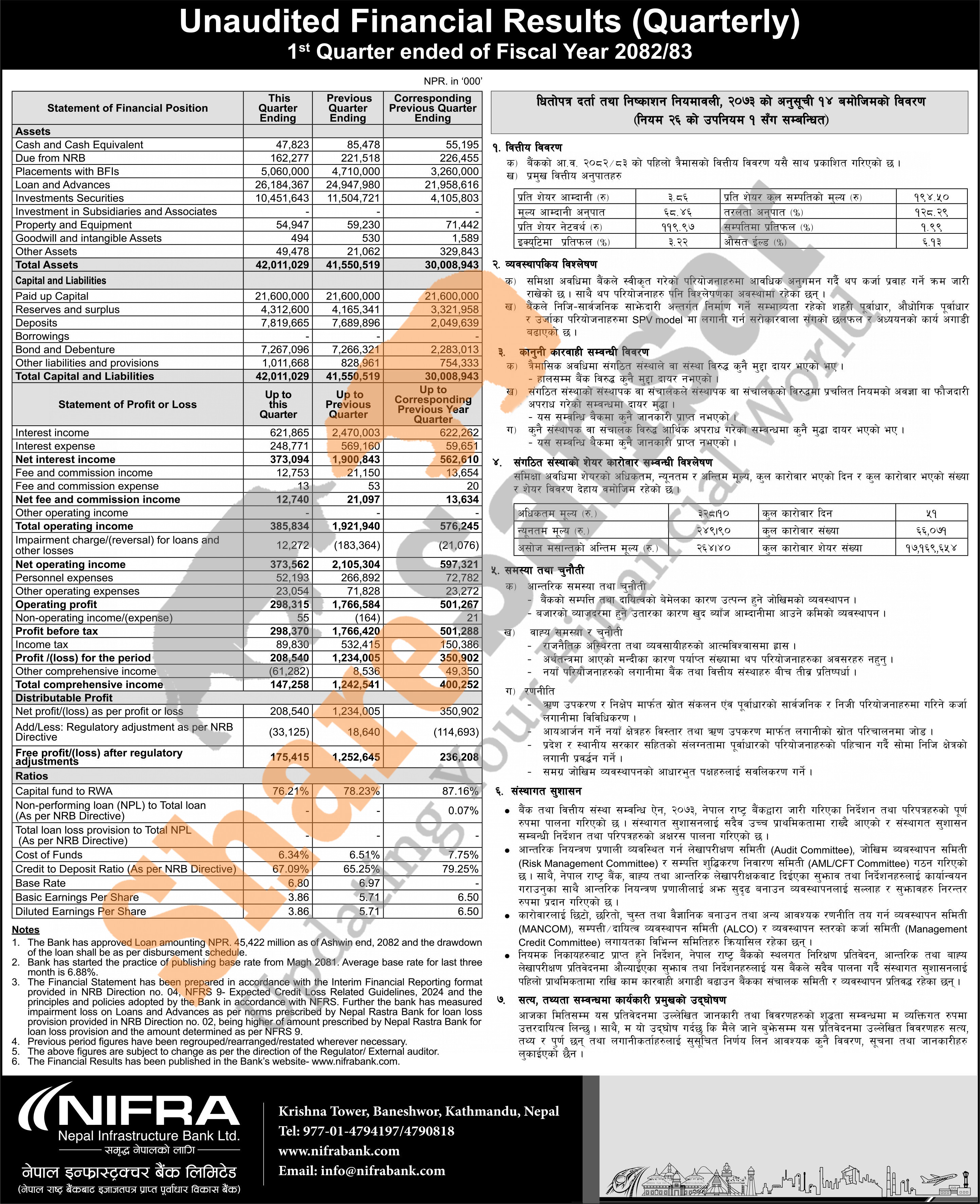 Nepal Infrastructure Bank Limited has posted a net profit of Rs 208.54 million and published its 1st quarter company analysis of the fiscal year 2082/83.