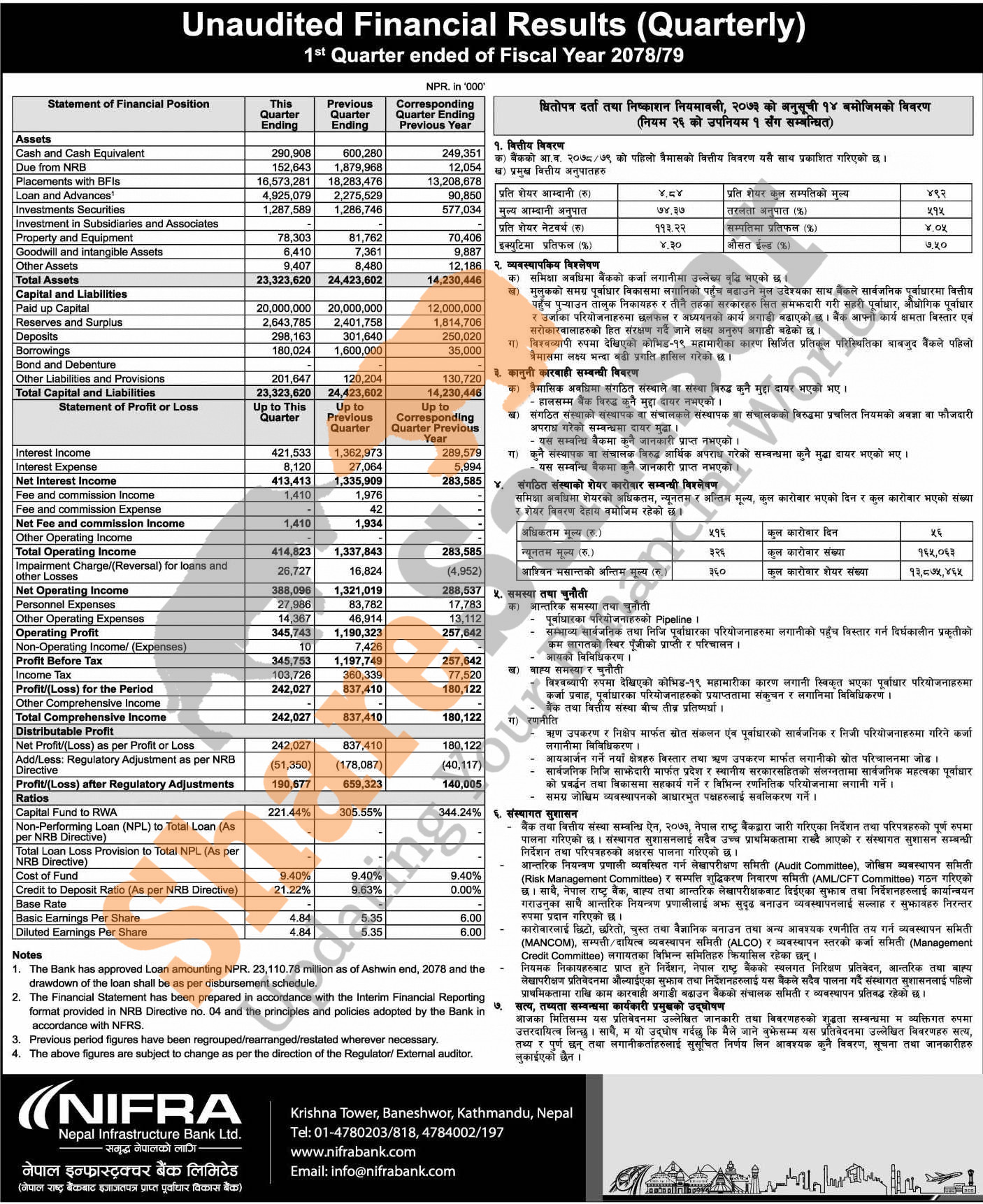 Nepal Infrastructure Bank Limited has posted a net profit of Rs 242.02 million and published its 1st quarter company analysis of the fiscal year 2078/79.