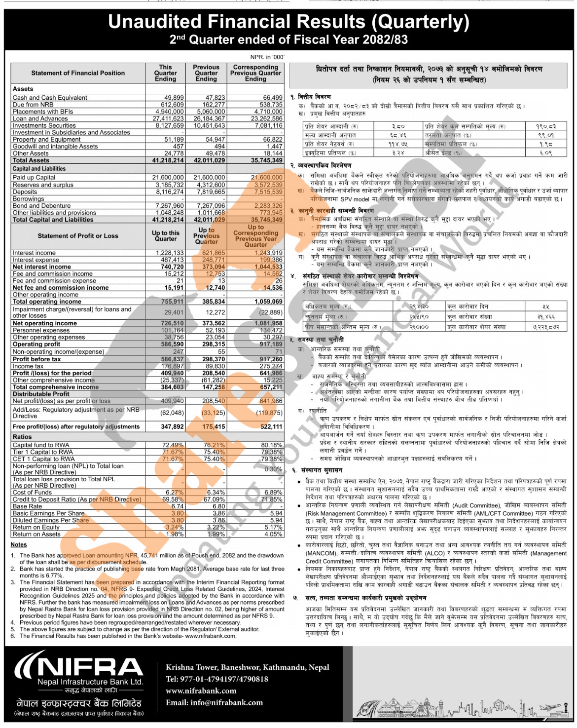 Nepal Infrastructure Bank Limited has posted a net profit of Rs 409.94 million and published its 2nd quarter company analysis of the fiscal year 2082/83.