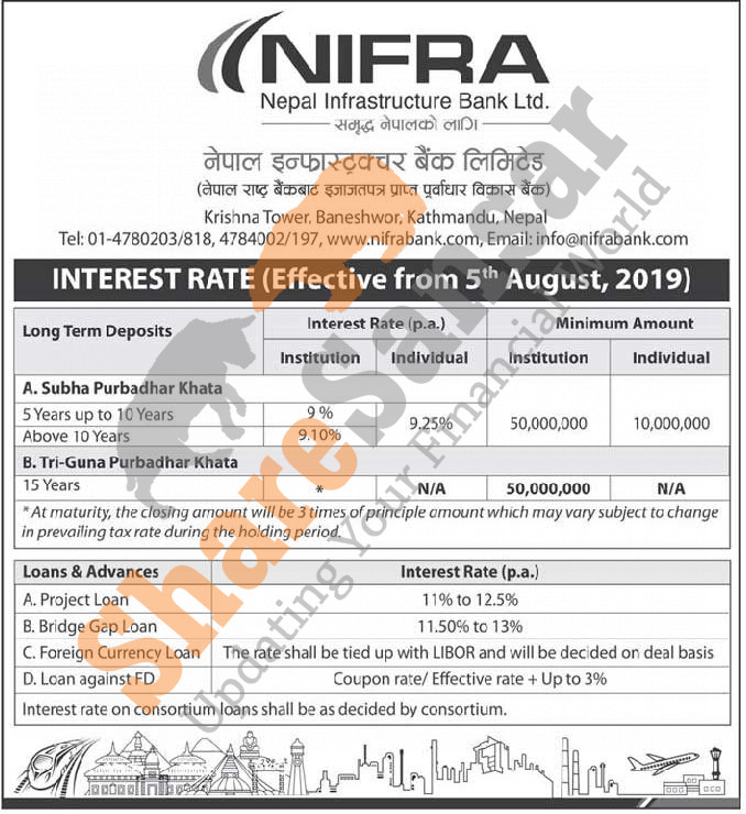 Nepal Infrastructure Bank Limited has published a notice regarding new interest rate and its effective from 20th Shrawan, 2076.
