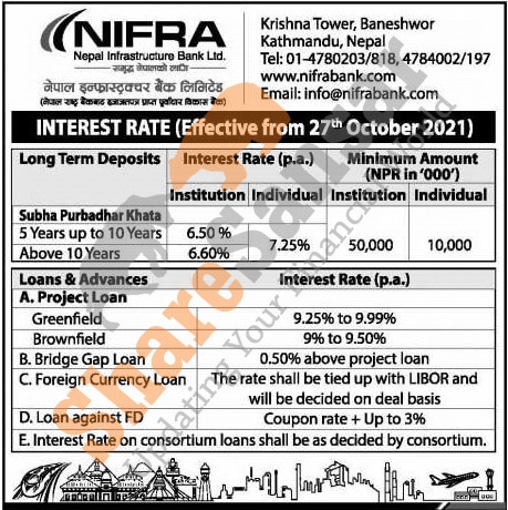 Nepal Infrastructure Bank Limited has published a notice regarding the new interest rate for deposit and loan products and it's effective from 10th Kartik, 2078.