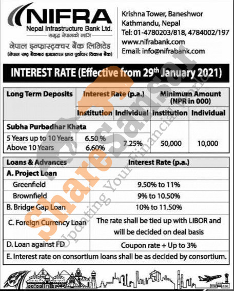 Nepal Infrastructure Bank Limited has published a notice regarding the new interest rate for deposit and loan products and it's effective from 16th Magh, 2077.