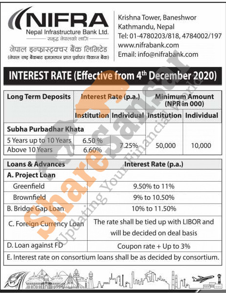 Nepal Infrastructure Bank Limited has published a notice regarding the new interest rate for its loan products and it's effective from 19th Mangsir, 2077.