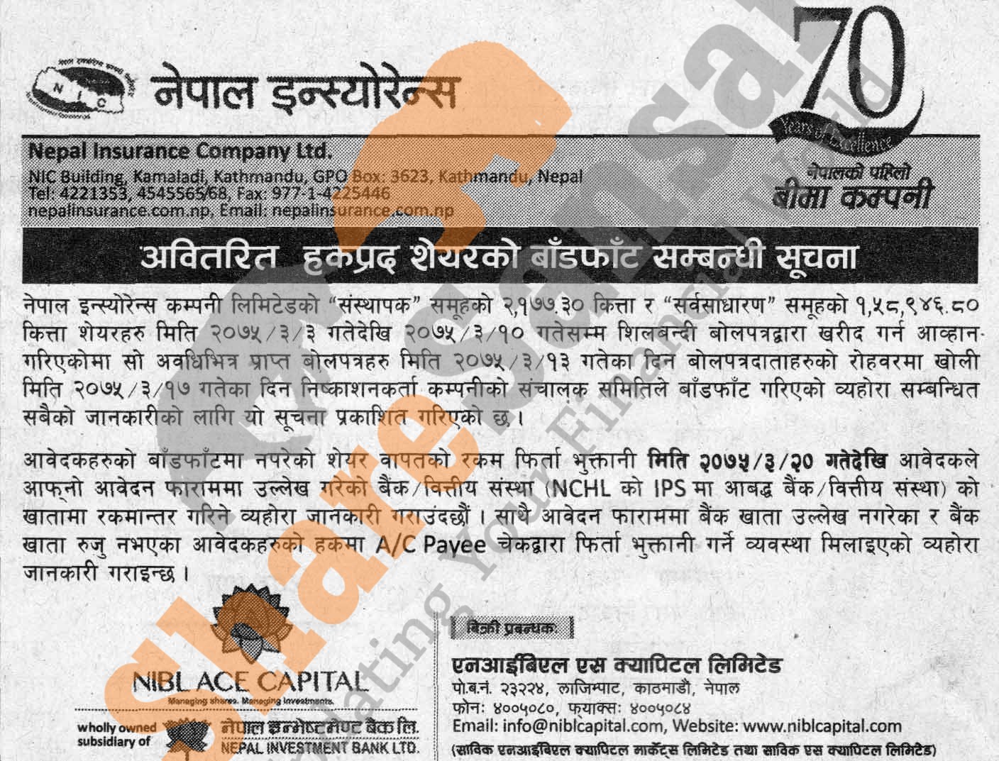 Nepal Insurance Company Limited has allotted its 2,177.30 units promoter share and 1,58,946.80 units ordinary share in auction to the general public on 17th Ashad, 2075 and refunding money to non-allottee investors from 20th Ashad, 2075.