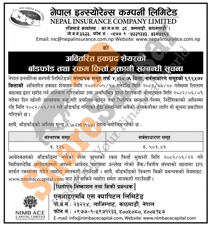 Nepal Insurance Company Limited has allotted its 4,468.76 units promoter right shares and 1,92,574 units ordinary right shares in an auction to the interested person/company/institutions on 22nd Ashwin, 2082 and also has published a notice regarding its auction cut-off price.