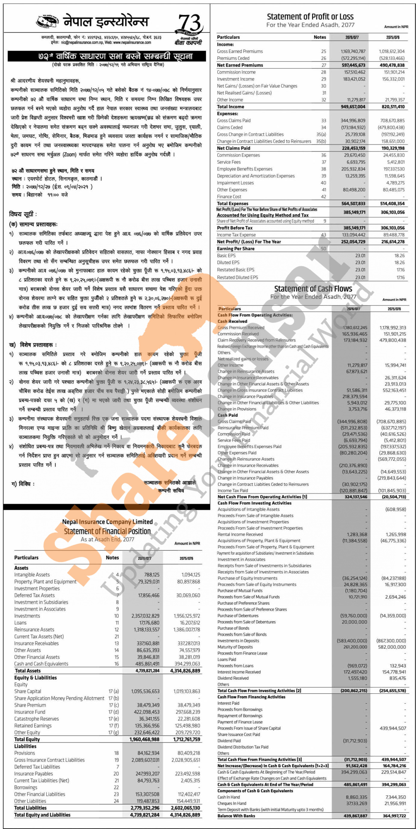 Nepal Insurance Company Limited has announced its 72nd AGM going to be held on 27th Chaitra, 2077 and has published its financial highlights of fiscal year 2076/77.