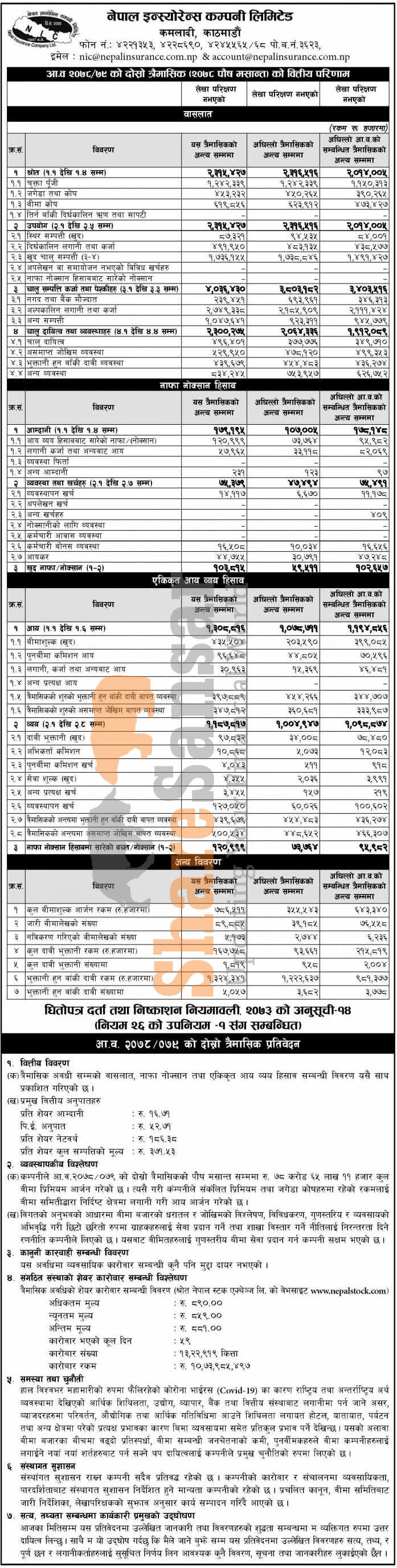 Nepal Insurance Company Limited has posted a net profit of Rs 103.81 million and published its 2nd quarter company analysis of the fiscal year 2078/79.
