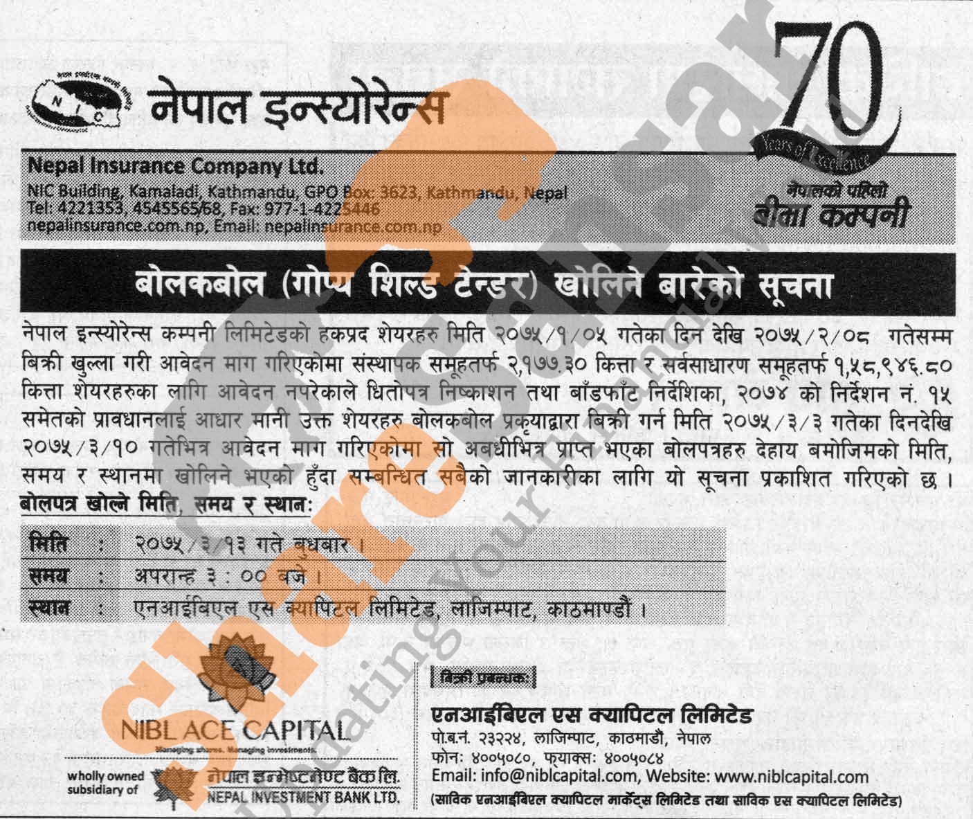 Nepal Insurance Company Limited has published a notice regarding bid opening date of 2,177.30 units promoter share and 1,58,946.80 units ordinary share in auction to the general public on (13th Ashad, 2075).