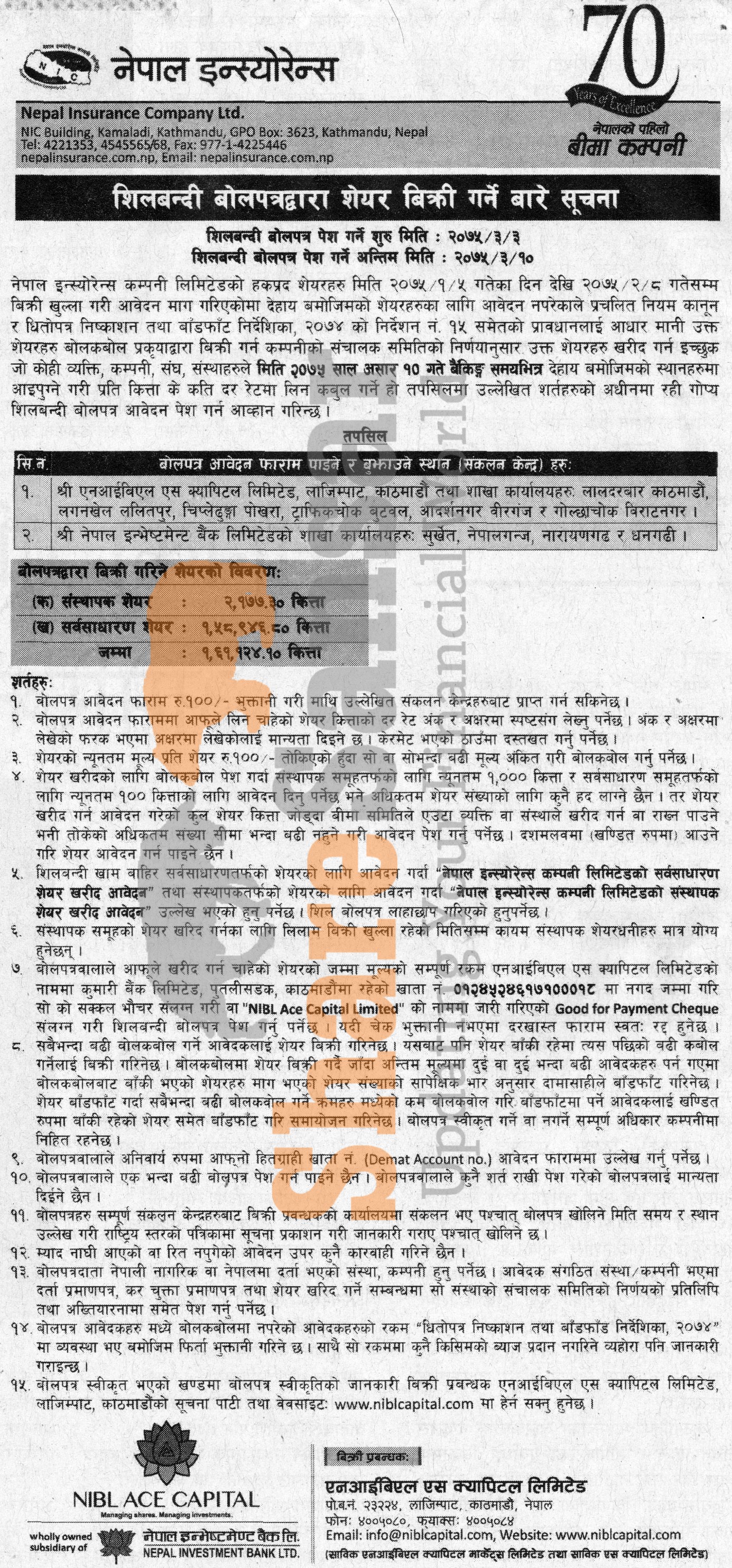 Nepal Insurance Company Limited is selling its 2,177.30 unit promoter shares and 1,58,946.80 unit ordinary shares in auction to the general public from (3rd to 10th Ashad, 2075).