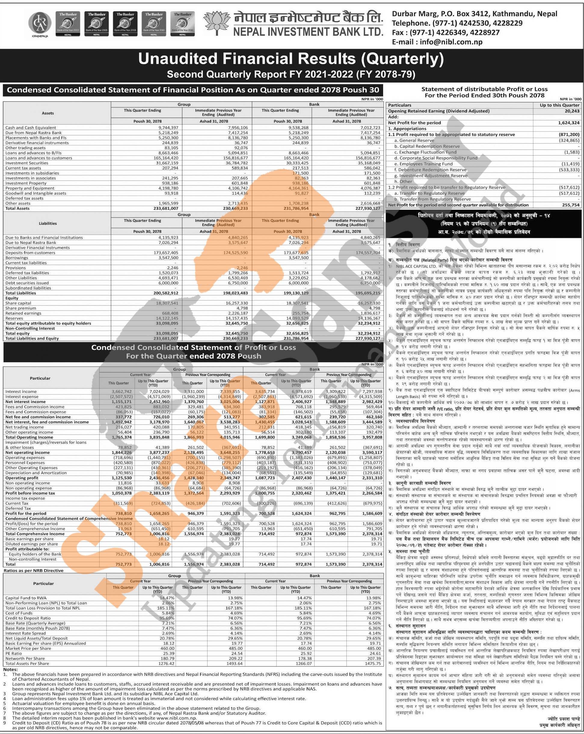 Nepal Investment Bank Limited has posted a net profit of Rs 1.62 billion and published its 2nd quarter company analysis of the fiscal year 2078/79.