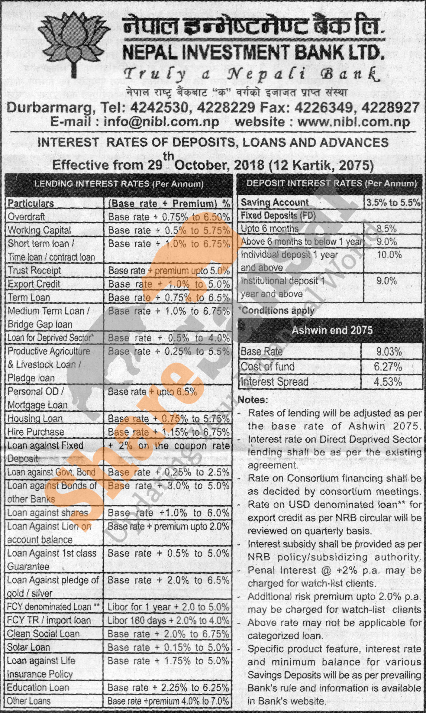 Nepal Investment Bank Limited has published a notice regarding new interest rate and its effective from 12th Kartik, 2075.